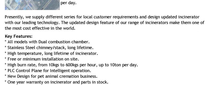 Items/Model TS30(PLC) Picture Burn Rate Average 30 kg/hour Feed Capacity Average 60kg per feeding Control Mode PLC(Programmable Logic Controller Incinerator) Auto Control and Display …